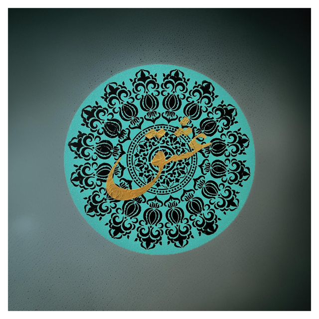 A 12 inch round stretch Canvas. Gold Love ( eshgh ) on top of Turquoise blue base color and black mandala back ground. Ready to use